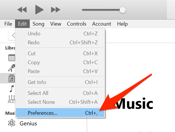 - Click on the Edit menu at the top and select Preferences to open the iTunes settings menu.