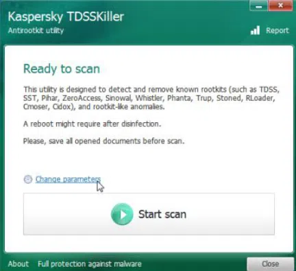 Step 1. After installation, double click on tdsskiller.exe to open this software. Then click on "Change Parameters".